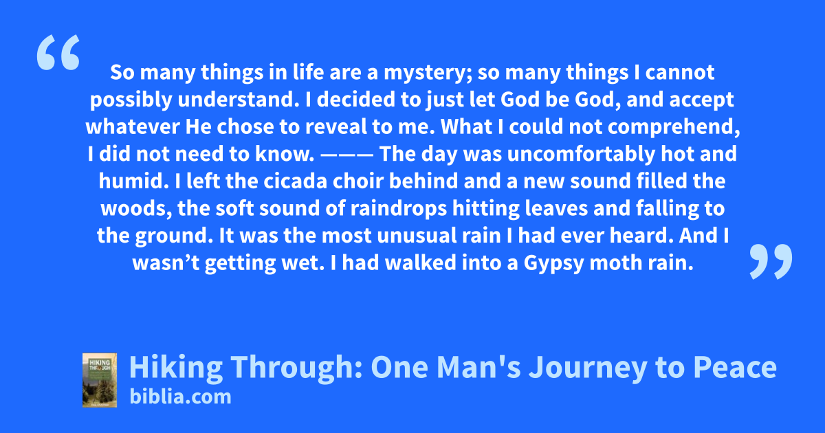 So many things in life are a mystery; so many things I cannot possibly understand. I decided to just let God be God, and accept whatever He chose to reveal to me. What I could not comprehend, I did not need to know. ——— The day was uncomfortably hot and humid. I left the cicada choir behind and a new sound filled the woods, the soft sound of raindrops hitting leaves and falling to the ground. It was the most unusual rain I had ever heard. And I wasn’t getting wet. I had walked into a Gypsy moth rain.