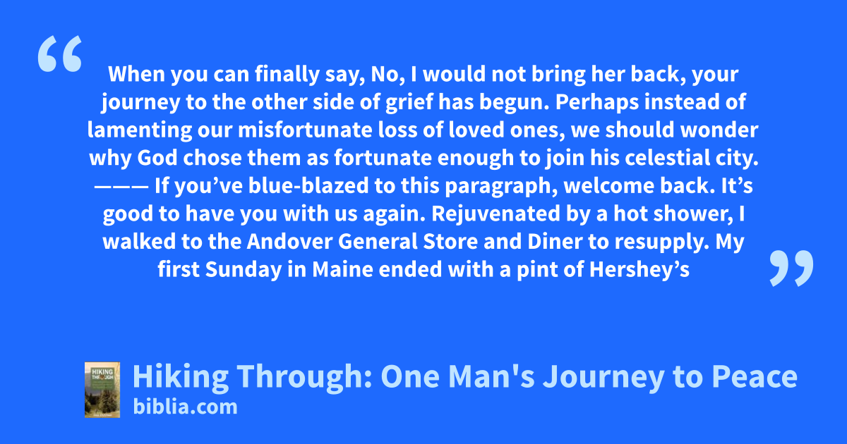 When you can finally say, No, I would not bring her back, your journey to the other side of grief has begun. Perhaps instead of lamenting our misfortunate loss of loved ones, we should wonder why God chose them as fortunate enough to join his celestial city. ——— If you’ve blue-blazed to this paragraph, welcome back. It’s good to have you with us again. Rejuvenated by a hot shower, I walked to the Andover General Store and Diner to resupply. My first Sunday in Maine ended with a pint of Hershey’s