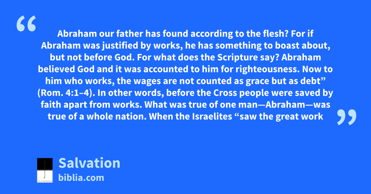 Abraham our father has found according to the flesh? For if Abraham was justified by works, he has something to boast about, but not before God. For what does the Scripture say? Abraham believed God and it was accounted to him for righteousness. Now to him who works, the wages are not counted as grace but as debt” (Rom. 4:1–4). In other words, before the Cross people were saved by faith apart from works. What was true of one man—Abraham—was true of a whole nation. When the Israelites “saw the great work