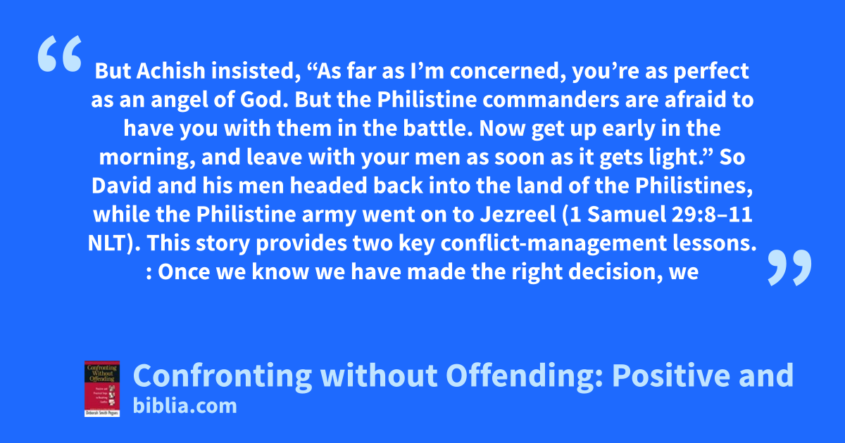 But Achish insisted, “As far as I’m concerned, you’re as perfect as an angel of God. But the Philistine commanders are afraid to have you with them in the battle. Now get up early in the morning, and leave with your men as soon as it gets light.” So David and his men headed back into the land of the Philistines, while the Philistine army went on to Jezreel (1 Samuel 29:8–11 NLT). This story provides two key conflict-management lessons. : Once we know we have made the right decision, we