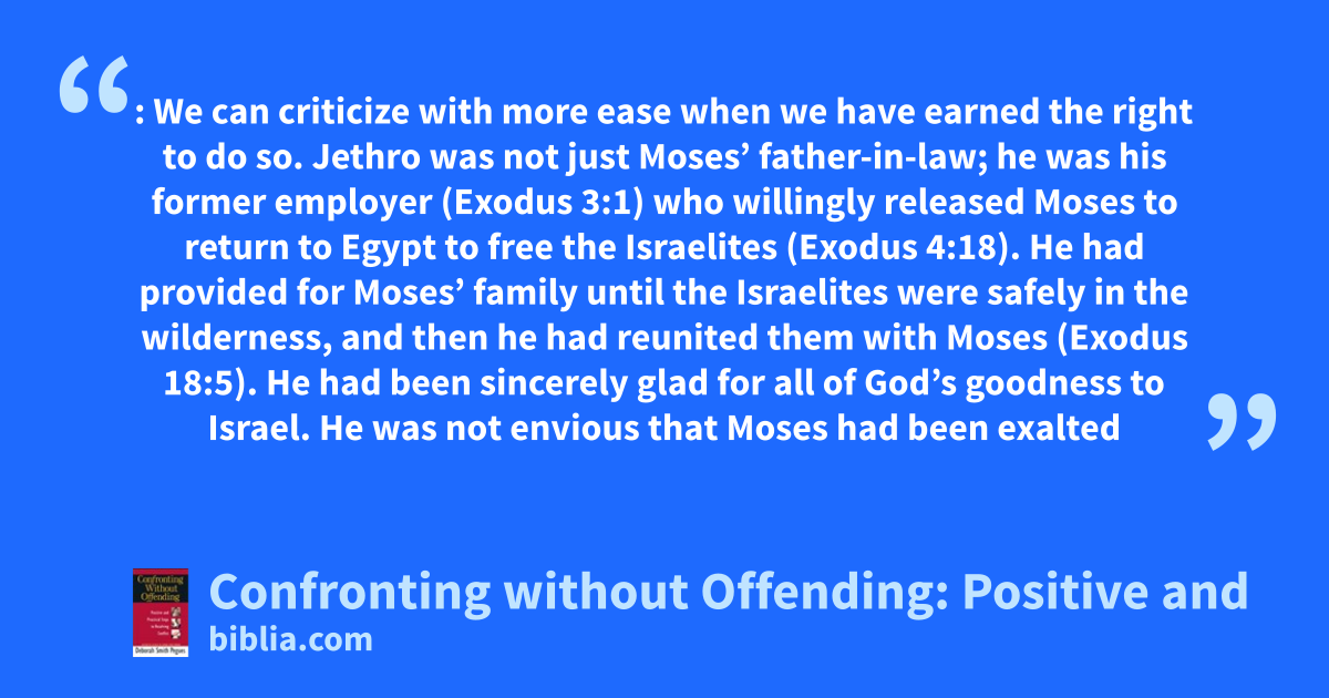 : We can criticize with more ease when we have earned the right to do so. Jethro was not just Moses’ father-in-law; he was his former employer (Exodus 3:1) who willingly released Moses to return to Egypt to free the Israelites (Exodus 4:18). He had provided for Moses’ family until the Israelites were safely in the wilderness, and then he had reunited them with Moses (Exodus 18:5). He had been sincerely glad for all of God’s goodness to Israel. He was not envious that Moses had been exalted