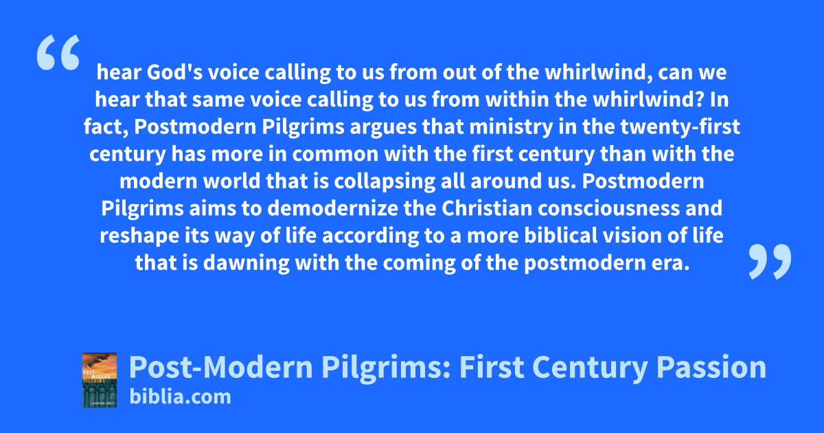 hear God's voice calling to us from out of the whirlwind, can we hear that same voice calling to us from within the whirlwind? In fact, Postmodern Pilgrims argues that ministry in the twenty-first century has more in common with the first century than with the modern world that is collapsing all around us. Postmodern Pilgrims aims to demodernize the Christian consciousness and reshape its way of life according to a more biblical vision of life that is dawning with the coming of the postmodern era.