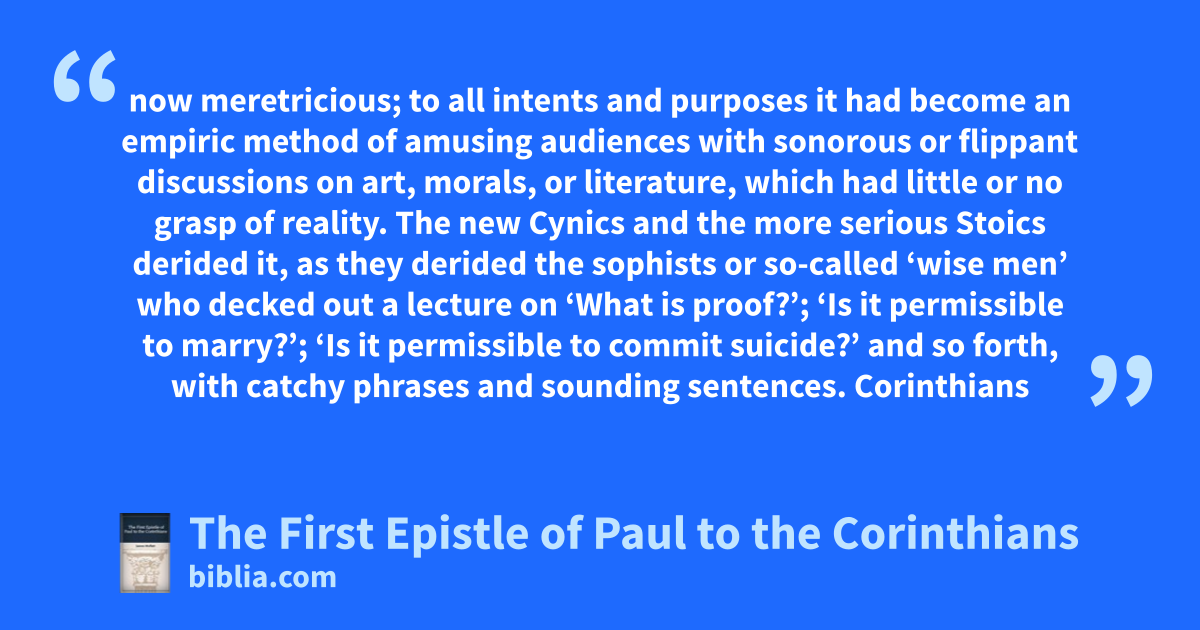now meretricious; to all intents and purposes it had become an empiric method of amusing audiences with sonorous or flippant discussions on art, morals, or literature, which had little or no grasp of reality. The new Cynics and the more serious Stoics derided it, as they derided the sophists or so-called ‘wise men’ who decked out a lecture on ‘What is proof?’; ‘Is it permissible to marry?’; ‘Is it permissible to commit suicide?’ and so forth, with catchy phrases and sounding sentences. Corinthians