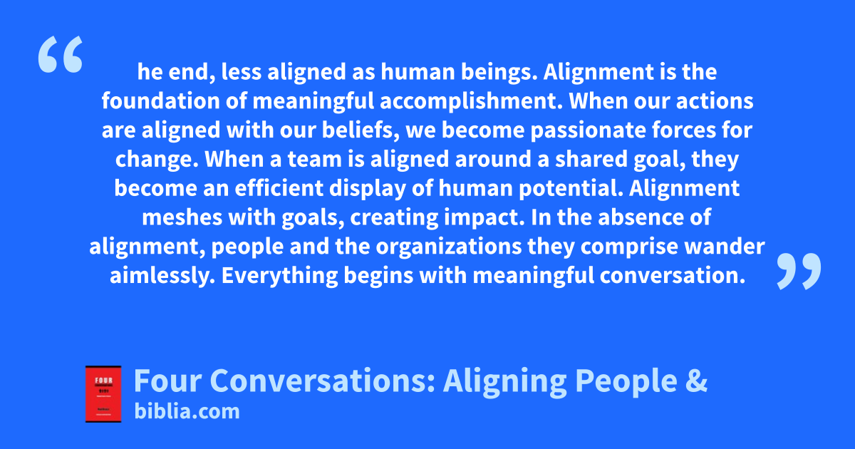 he end, less aligned as human beings. Alignment is the foundation of meaningful accomplishment. When our actions are aligned with our beliefs, we become passionate forces for change. When a team is aligned around a shared goal, they become an efficient display of human potential. Alignment meshes with goals, creating impact. In the absence of alignment, people and the organizations they comprise wander aimlessly. Everything begins with meaningful conversation.