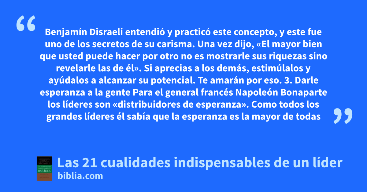 Benjamín Disraeli entendió y practicó este concepto, y este fue uno de los secretos de su carisma. Una vez dijo, «El mayor bien que usted puede hacer por otro no es mostrarle sus riquezas sino revelarle las de él». Si aprecias a los demás, estimúlalos y ayúdalos a alcanzar su potencial. Te amarán por eso. 3. Darle esperanza a la gente Para el general francés Napoleón Bonaparte los líderes son «distribuidores de esperanza». Como todos los grandes líderes él sabía que la esperanza es la mayor de todas