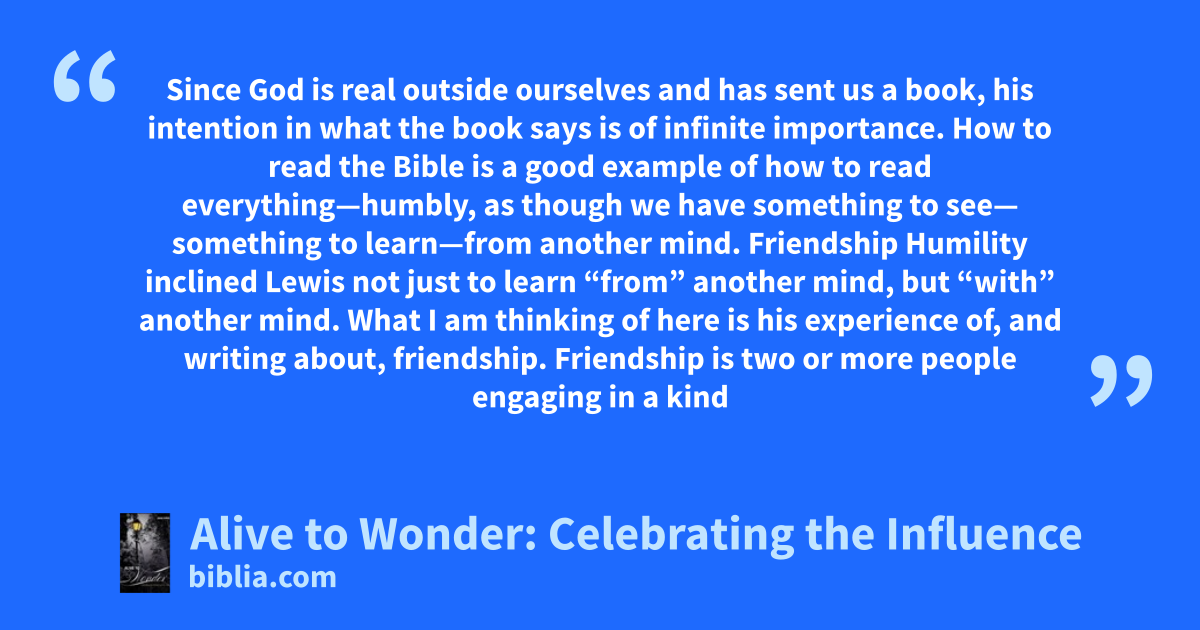 Since God is real outside ourselves and has sent us a book, his intention in what the book says is of infinite importance. How to read the Bible is a good example of how to read everything—humbly, as though we have something to see— something to learn—from another mind. Friendship Humility inclined Lewis not just to learn “from” another mind, but “with” another mind. What I am thinking of here is his experience of, and writing about, friendship. Friendship is two or more people engaging in a kind