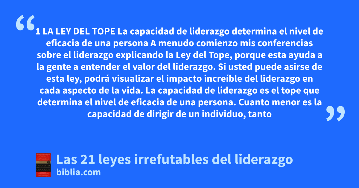 1 LA LEY DEL TOPE La capacidad de liderazgo determina el nivel de eficacia de una persona A menudo comienzo mis conferencias sobre el liderazgo explicando la Ley del Tope, porque esta ayuda a la gente a entender el valor del liderazgo. Si usted puede asirse de esta ley, podrá visualizar el impacto increíble del liderazgo en cada aspecto de la vida. La capacidad de liderazgo es el tope que determina el nivel de eficacia de una persona. Cuanto menor es la capacidad de dirigir de un individuo, tanto