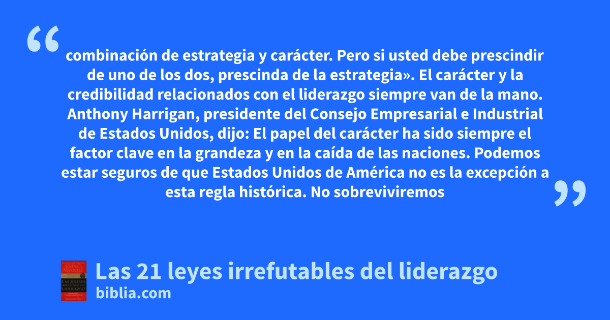 combinación de estrategia y carácter. Pero si usted debe prescindir de uno de los dos, prescinda de la estrategia». El carácter y la credibilidad relacionados con el liderazgo siempre van de la mano. Anthony Harrigan, presidente del Consejo Empresarial e Industrial de Estados Unidos, dijo: El papel del carácter ha sido siempre el factor clave en la grandeza y en la caída de las naciones. Podemos estar seguros de que Estados Unidos de América no es la excepción a esta regla histórica. No sobreviviremos