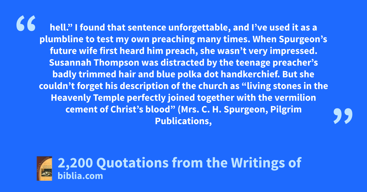hell.” I found that sentence unforgettable, and I’ve used it as a plumbline to test my own preaching many times. When Spurgeon’s future wife first heard him preach, she wasn’t very impressed. Susannah Thompson was distracted by the teenage preacher’s badly trimmed hair and blue polka dot handkerchief. But she couldn’t forget his description of the church as “living stones in the Heavenly Temple perfectly joined together with the vermilion cement of Christ’s blood” (Mrs. C. H. Spurgeon, Pilgrim Publications,