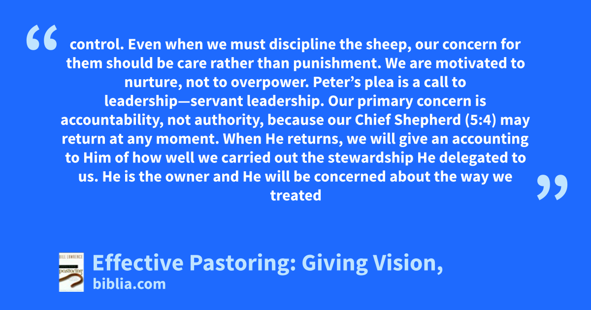control. Even when we must discipline the sheep, our concern for them should be care rather than punishment. We are motivated to nurture, not to overpower. Peter’s plea is a call to leadership—servant leadership. Our primary concern is accountability, not authority, because our Chief Shepherd (5:4) may return at any moment. When He returns, we will give an accounting to Him of how well we carried out the stewardship He delegated to us. He is the owner and He will be concerned about the way we treated