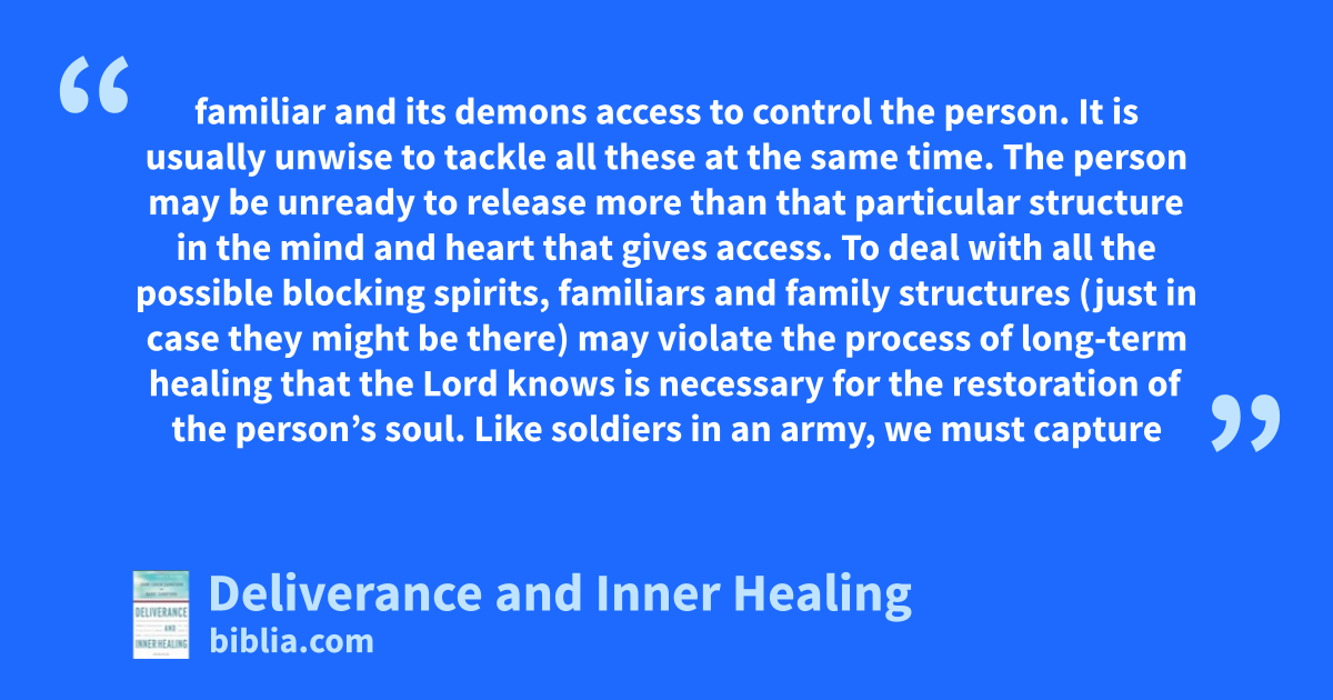 familiar and its demons access to control the person. It is usually unwise to tackle all these at the same time. The person may be unready to release more than that particular structure in the mind and heart that gives access. To deal with all the possible blocking spirits, familiars and family structures (just in case they might be there) may violate the process of long-term healing that the Lord knows is necessary for the restoration of the person’s soul. Like soldiers in an army, we must capture