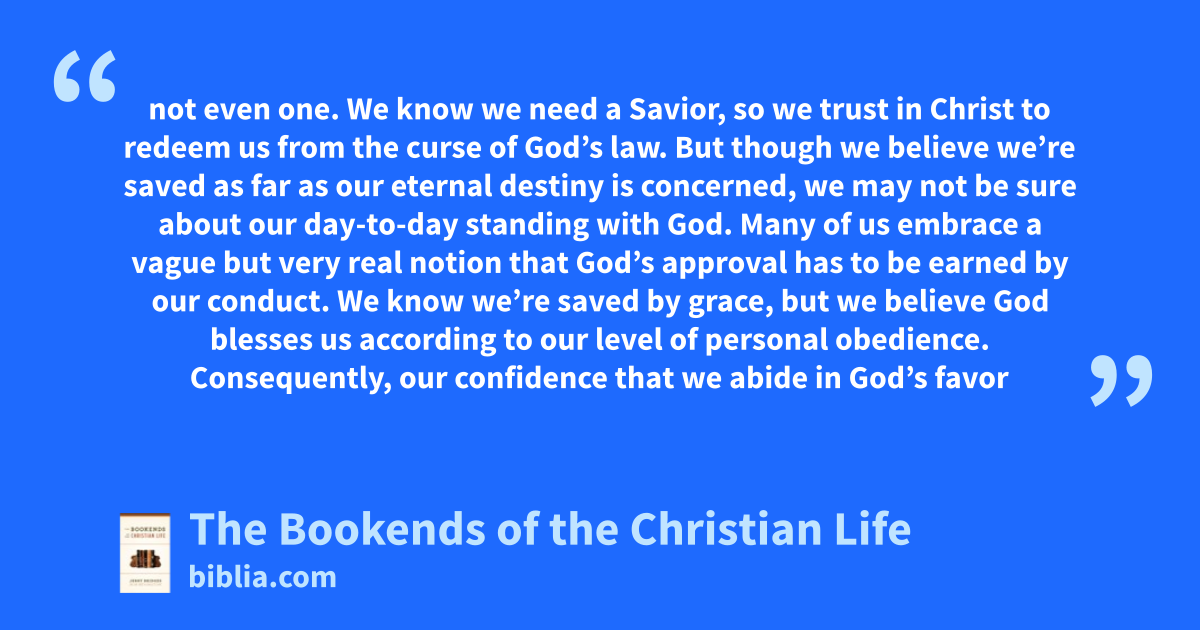 not even one. We know we need a Savior, so we trust in Christ to redeem us from the curse of God’s law. But though we believe we’re saved as far as our eternal destiny is concerned, we may not be sure about our day-to-day standing with God. Many of us embrace a vague but very real notion that God’s approval has to be earned by our conduct. We know we’re saved by grace, but we believe God blesses us according to our level of personal obedience. Consequently, our confidence that we abide in God’s favor