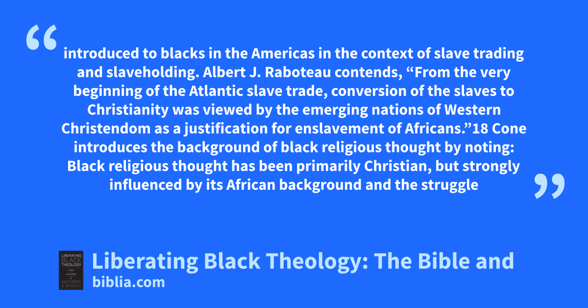 introduced to blacks in the Americas in the context of slave trading and slaveholding. Albert J. Raboteau contends, “From the very beginning of the Atlantic slave trade, conversion of the slaves to Christianity was viewed by the emerging nations of Western Christendom as a justification for enslavement of Africans.”18 Cone introduces the background of black religious thought by noting: Black religious thought has been primarily Christian, but strongly influenced by its African background and the struggle