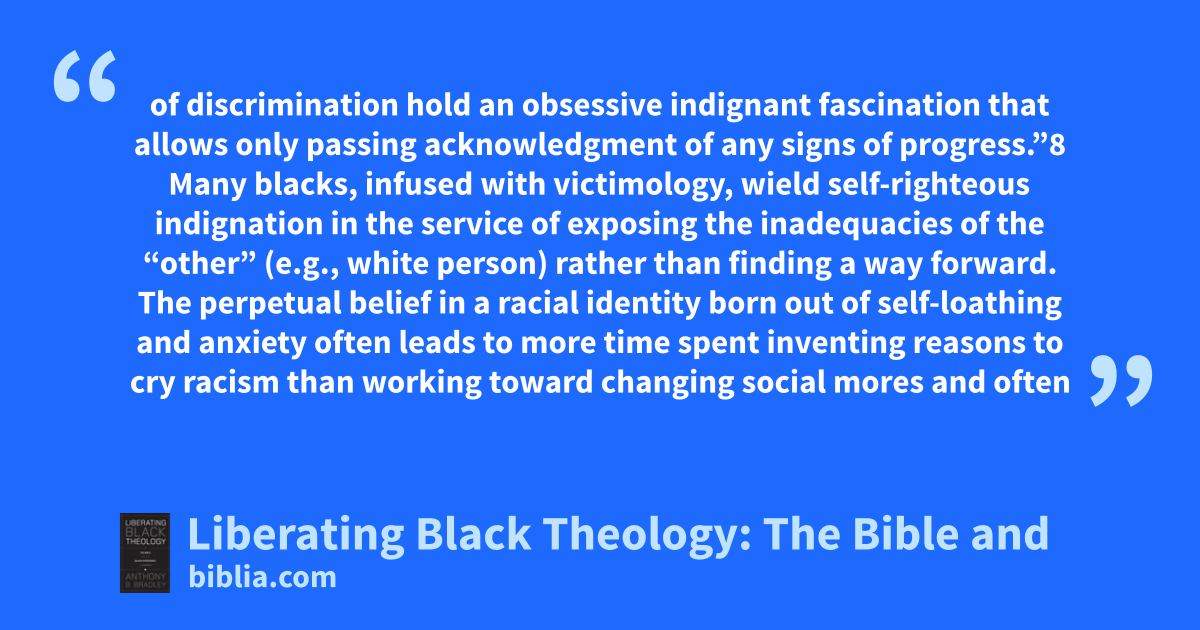 of discrimination hold an obsessive indignant fascination that allows only passing acknowledgment of any signs of progress.”8 Many blacks, infused with victimology, wield self-righteous indignation in the service of exposing the inadequacies of the “other” (e.g., white person) rather than finding a way forward. The perpetual belief in a racial identity born out of self-loathing and anxiety often leads to more time spent inventing reasons to cry racism than working toward changing social mores and often