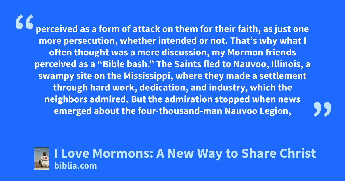 perceived as a form of attack on them for their faith, as just one more persecution, whether intended or not. That’s why what I often thought was a mere discussion, my Mormon friends perceived as a “Bible bash.” The Saints fled to Nauvoo, Illinois, a swampy site on the Mississippi, where they made a settlement through hard work, dedication, and industry, which the neighbors admired. But the admiration stopped when news emerged about the four-thousand-man Nauvoo Legion,