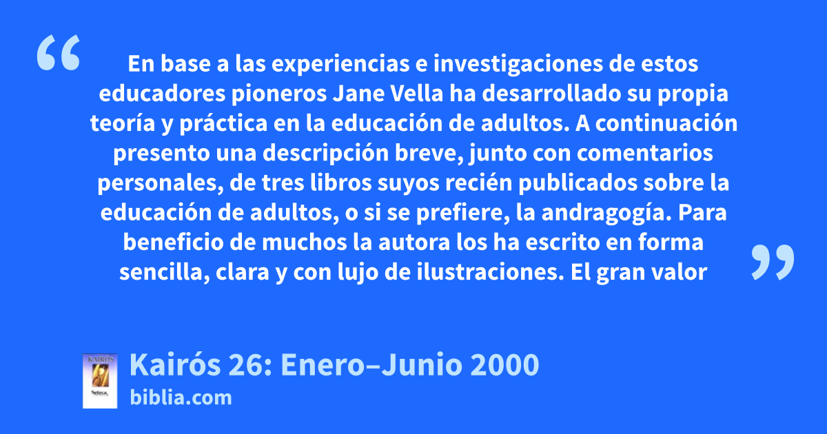 En base a las experiencias e investigaciones de estos educadores pioneros Jane Vella ha desarrollado su propia teoría y práctica en la educación de adultos. A continuación presento una descripción breve, junto con comentarios personales, de tres libros suyos recién publicados sobre la educación de adultos, o si se prefiere, la andragogía. Para beneficio de muchos la autora los ha escrito en forma sencilla, clara y con lujo de ilustraciones. El gran valor