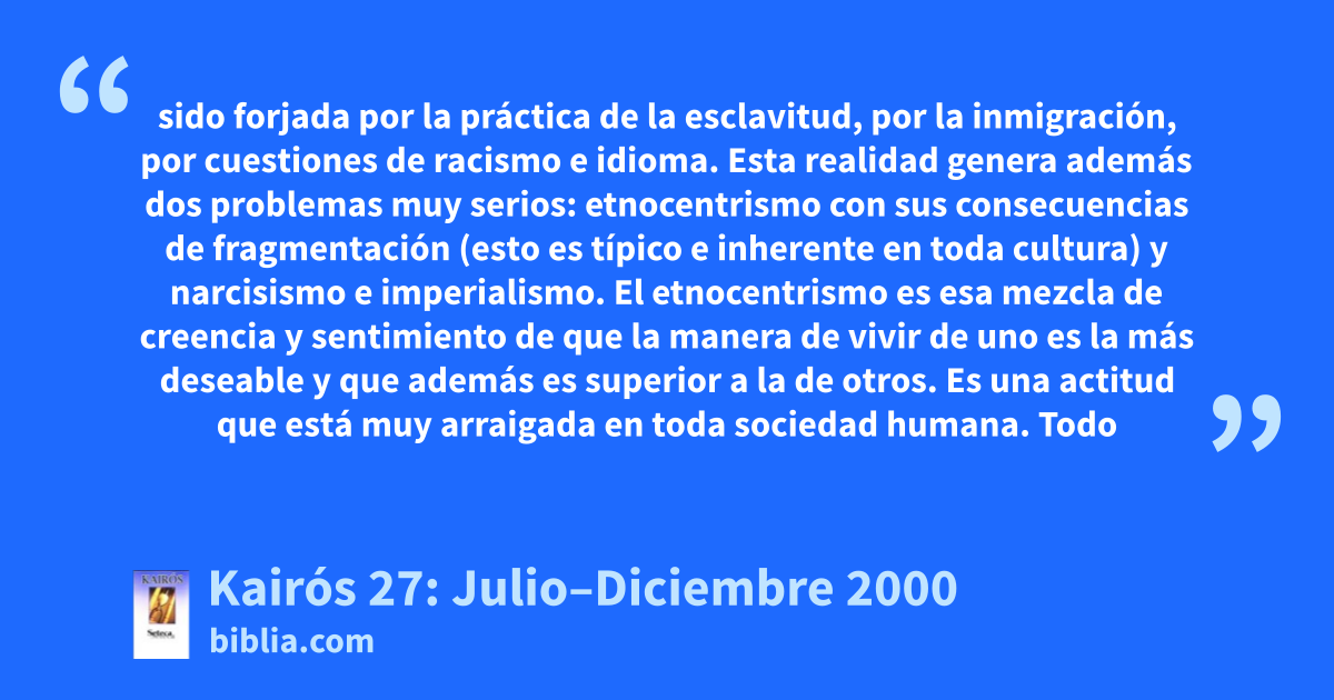 sido forjada por la práctica de la esclavitud, por la inmigración, por cuestiones de racismo e idioma. Esta realidad genera además dos problemas muy serios: etnocentrismo con sus consecuencias de fragmentación (esto es típico e inherente en toda cultura) y narcisismo e imperialismo. El etnocentrismo es esa mezcla de creencia y sentimiento de que la manera de vivir de uno es la más deseable y que además es superior a la de otros. Es una actitud que está muy arraigada en toda sociedad humana. Todo