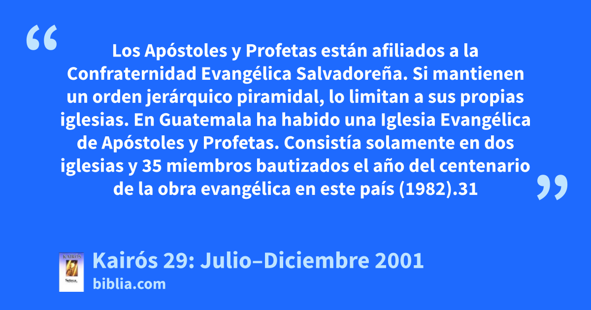 Los Apóstoles y Profetas están afiliados a la Confraternidad Evangélica Salvadoreña. Si mantienen un orden jerárquico piramidal, lo limitan a sus propias iglesias. En Guatemala ha habido una Iglesia Evangélica de Apóstoles y Profetas. Consistía solamente en dos iglesias y 35 miembros bautizados el año del centenario de la obra evangélica en este país (1982).31