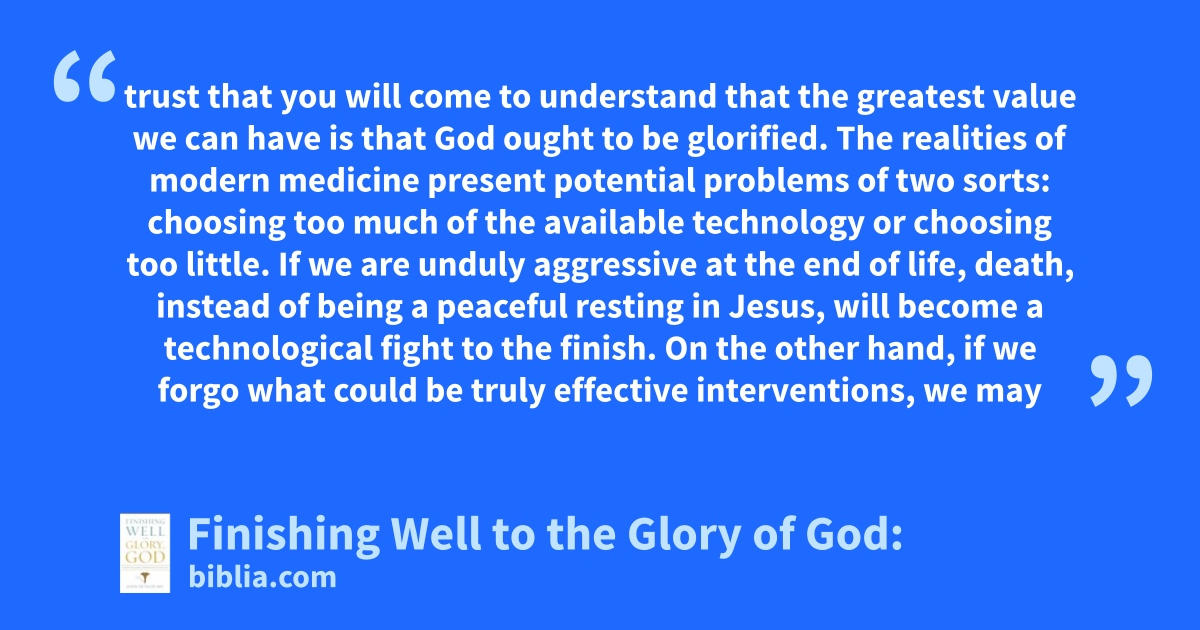 trust that you will come to understand that the greatest value we can have is that God ought to be glorified. The realities of modern medicine present potential problems of two sorts: choosing too much of the available technology or choosing too little. If we are unduly aggressive at the end of life, death, instead of being a peaceful resting in Jesus, will become a technological fight to the finish. On the other hand, if we forgo what could be truly effective interventions, we may