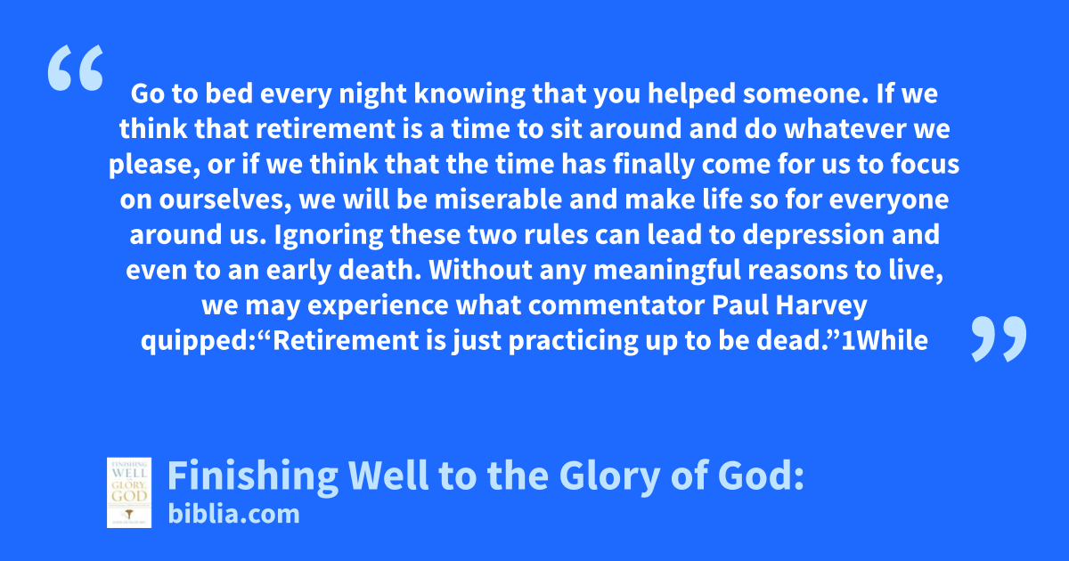 Go to bed every night knowing that you helped someone. If we think that retirement is a time to sit around and do whatever we please, or if we think that the time has finally come for us to focus on ourselves, we will be miserable and make life so for everyone around us. Ignoring these two rules can lead to depression and even to an early death. Without any meaningful reasons to live, we may experience what commentator Paul Harvey quipped:“Retirement is just practicing up to be dead.”1While