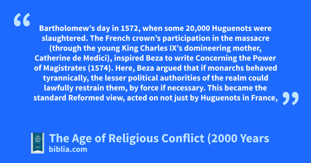 Bartholomew’s day in 1572, when some 20,000 Huguenots were slaughtered. The French crown’s participation in the massacre (through the young King Charles IX’s domineering mother, Catherine de Medici), inspired Beza to write Concerning the Power of Magistrates (1574). Here, Beza argued that if monarchs behaved tyrannically, the lesser political authorities of the realm could lawfully restrain them, by force if necessary. This became the standard Reformed view, acted on not just by Huguenots in France,