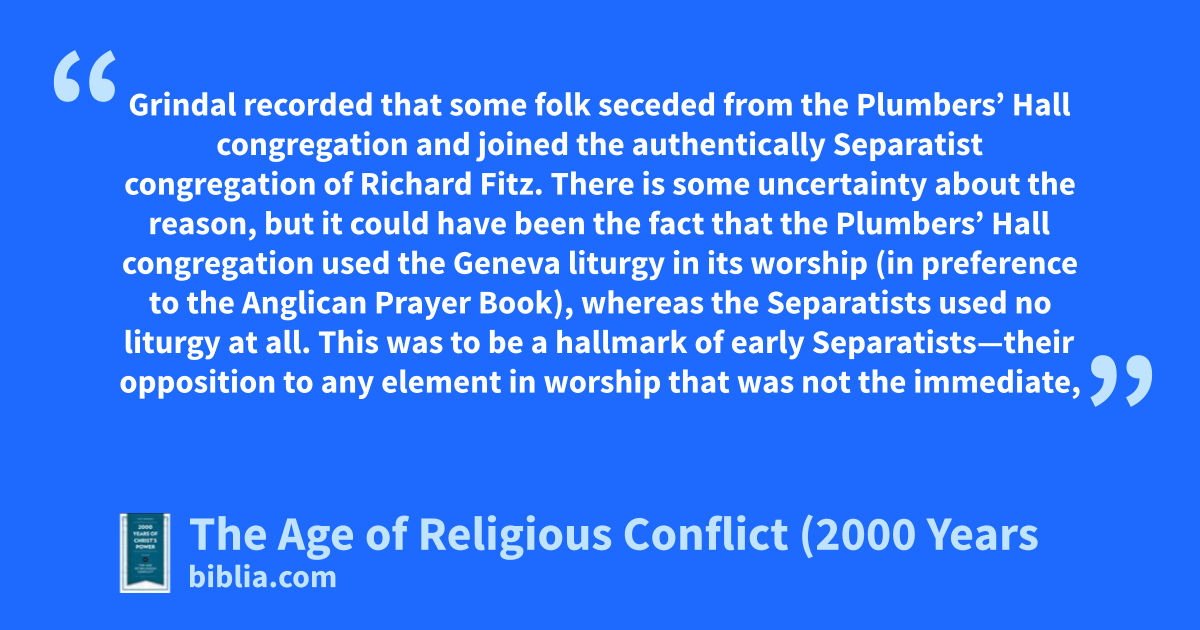 Grindal recorded that some folk seceded from the Plumbers’ Hall congregation and joined the authentically Separatist congregation of Richard Fitz. There is some uncertainty about the reason, but it could have been the fact that the Plumbers’ Hall congregation used the Geneva liturgy in its worship (in preference to the Anglican Prayer Book), whereas the Separatists used no liturgy at all. This was to be a hallmark of early Separatists—their opposition to any element in worship that was not the immediate,