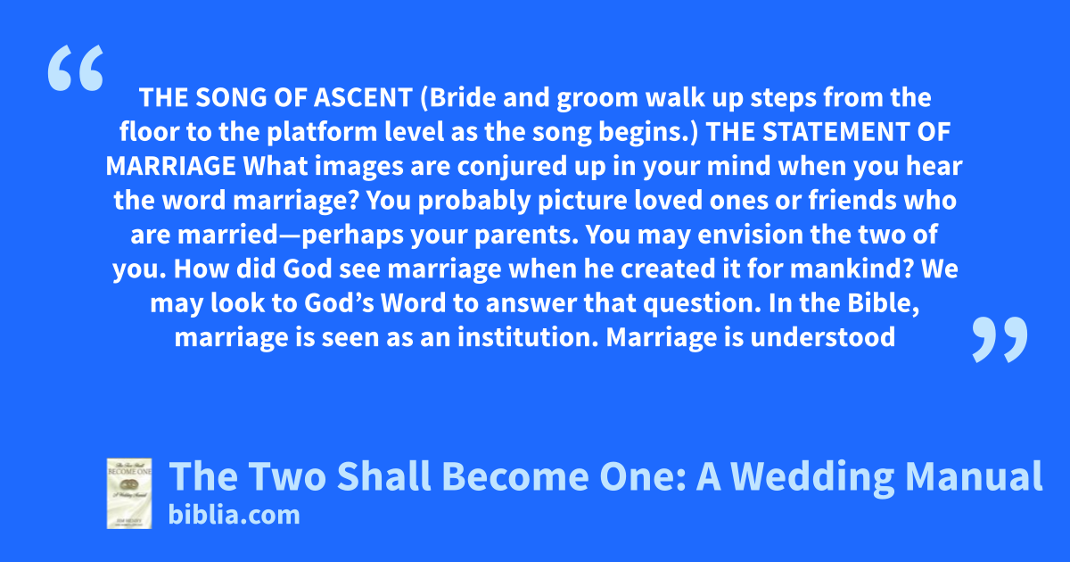 THE SONG OF ASCENT (Bride and groom walk up steps from the floor to the platform level as the song begins.) THE STATEMENT OF MARRIAGE What images are conjured up in your mind when you hear the word marriage? You probably picture loved ones or friends who are married—perhaps your parents. You may envision the two of you. How did God see marriage when he created it for mankind? We may look to God’s Word to answer that question. In the Bible, marriage is seen as an institution. Marriage is understood