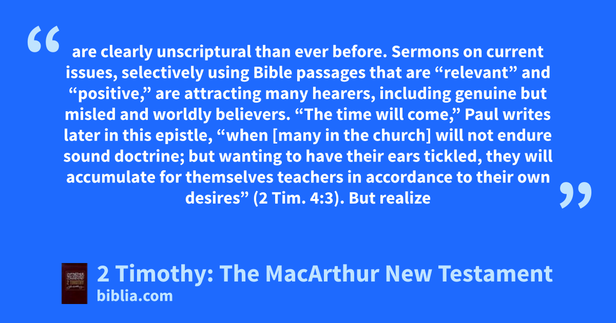 are clearly unscriptural than ever before. Sermons on current issues, selectively using Bible passages that are “relevant” and “positive,” are attracting many hearers, including genuine but misled and worldly believers. “The time will come,” Paul writes later in this epistle, “when [many in the church] will not endure sound doctrine; but wanting to have their ears tickled, they will accumulate for themselves teachers in accordance to their own desires” (2 Tim. 4:3). But realize