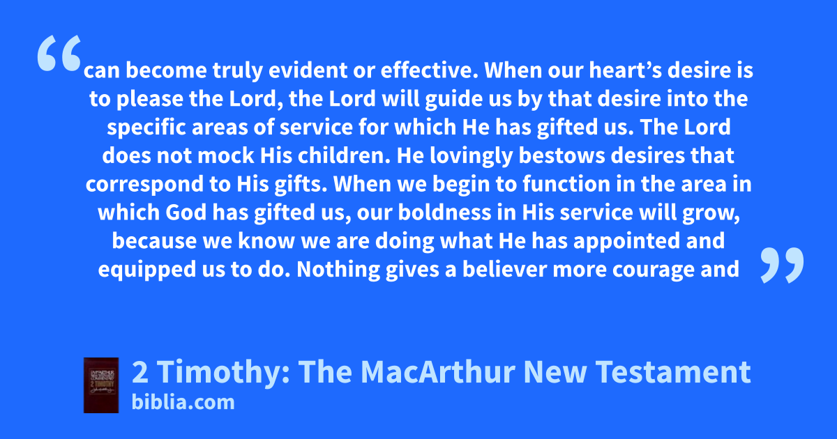 can become truly evident or effective. When our heart’s desire is to please the Lord, the Lord will guide us by that desire into the specific areas of service for which He has gifted us. The Lord does not mock His children. He lovingly bestows desires that correspond to His gifts. When we begin to function in the area in which God has gifted us, our boldness in His service will grow, because we know we are doing what He has appointed and equipped us to do. Nothing gives a believer more courage and