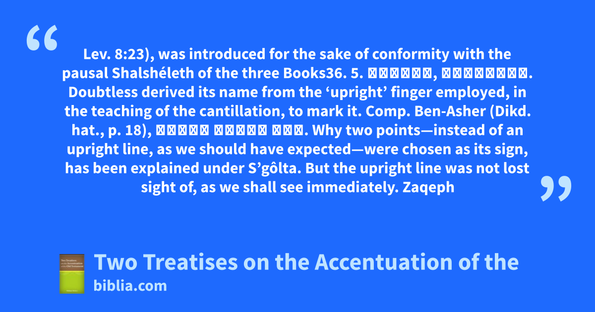 Lev. 8:23), was introduced for the sake of conformity with the pausal Shalshéleth of the three Books36. 5. זָקֵ֔ף, זַקְפָ֕א. Doubtless derived its name from the ‘upright’ finger employed, in the teaching of the cantillation, to mark it. Comp. Ben-Asher (Dikd. hat., p. 18), מיוחד באצבע זקף. Why two points—instead of an upright line, as we should have expected—were chosen as its sign, has been explained under S’gôlta. But the upright line was not lost sight of, as we shall see immediately. Zaqeph