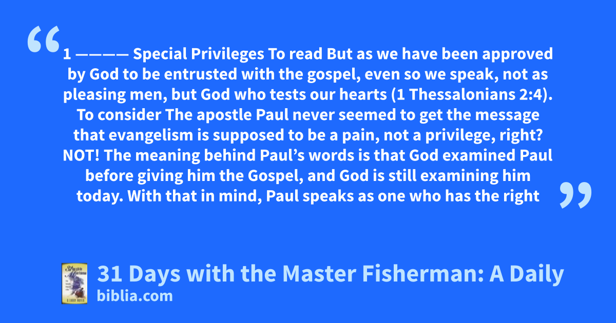 1 ———— Special Privileges To read But as we have been approved by God to be entrusted with the gospel, even so we speak, not as pleasing men, but God who tests our hearts (1 Thessalonians 2:4). To consider The apostle Paul never seemed to get the message that evangelism is supposed to be a pain, not a privilege, right? NOT! The meaning behind Paul’s words is that God examined Paul before giving him the Gospel, and God is still examining him today. With that in mind, Paul speaks as one who has the right
