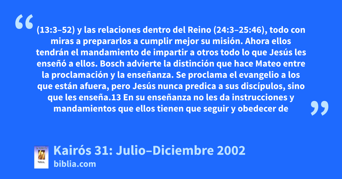 (13:3–52) y las relaciones dentro del Reino (24:3–25:46), todo con miras a prepararlos a cumplir mejor su misión. Ahora ellos tendrán el mandamiento de impartir a otros todo lo que Jesús les enseñó a ellos. Bosch advierte la distinción que hace Mateo entre la proclamación y la enseñanza. Se proclama el evangelio a los que están afuera, pero Jesús nunca predica a sus discípulos, sino que les enseña.13 En su enseñanza no les da instrucciones y mandamientos que ellos tienen que seguir y obedecer de
