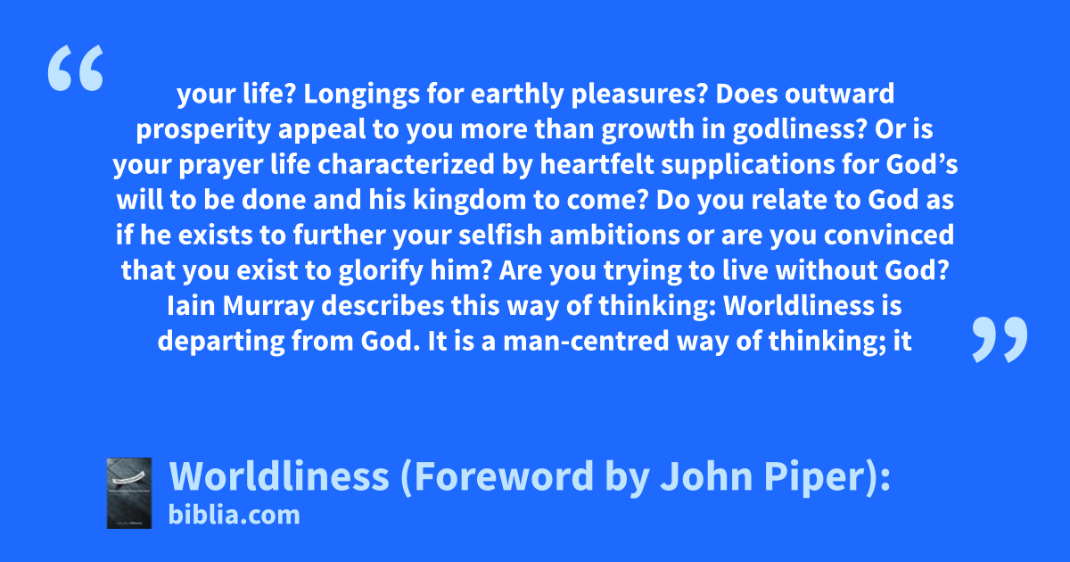 your life? Longings for earthly pleasures? Does outward prosperity appeal to you more than growth in godliness? Or is your prayer life characterized by heartfelt supplications for God’s will to be done and his kingdom to come? Do you relate to God as if he exists to further your selfish ambitions or are you convinced that you exist to glorify him? Are you trying to live without God? Iain Murray describes this way of thinking: Worldliness is departing from God. It is a man-centred way of thinking; it