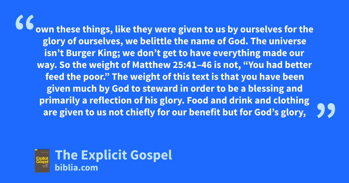 own these things, like they were given to us by ourselves for the glory of ourselves, we belittle the name of God. The universe isn’t Burger King; we don’t get to have everything made our way. So the weight of Matthew 25:41–46 is not, “You had better feed the poor.” The weight of this text is that you have been given much by God to steward in order to be a blessing and primarily a reflection of his glory. Food and drink and clothing are given to us not chiefly for our benefit but for God’s glory,
