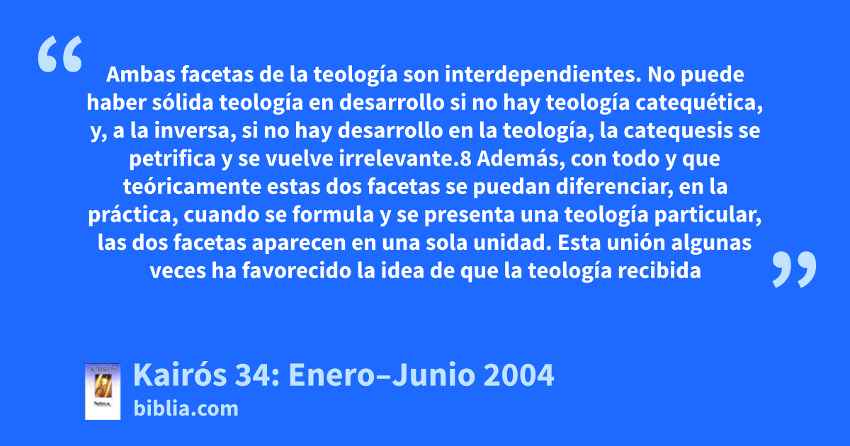 Ambas facetas de la teología son interdependientes. No puede haber sólida teología en desarrollo si no hay teología catequética, y, a la inversa, si no hay desarrollo en la teología, la catequesis se petrifica y se vuelve irrelevante.8 Además, con todo y que teóricamente estas dos facetas se puedan diferenciar, en la práctica, cuando se formula y se presenta una teología particular, las dos facetas aparecen en una sola unidad. Esta unión algunas veces ha favorecido la idea de que la teología recibida