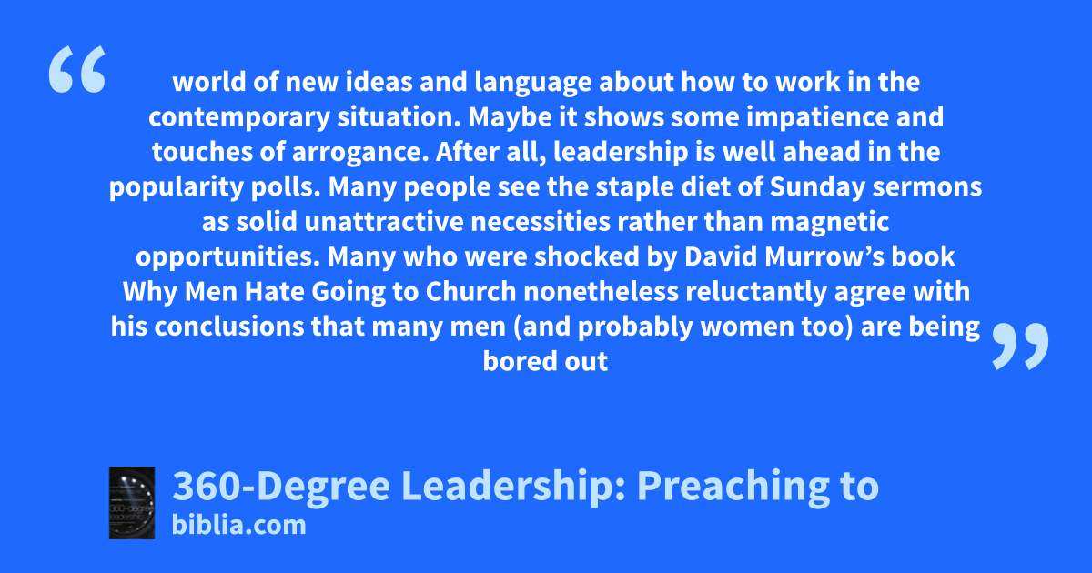 world of new ideas and language about how to work in the contemporary situation. Maybe it shows some impatience and touches of arrogance. After all, leadership is well ahead in the popularity polls. Many people see the staple diet of Sunday sermons as solid unattractive necessities rather than magnetic opportunities. Many who were shocked by David Murrow’s book Why Men Hate Going to Church nonetheless reluctantly agree with his conclusions that many men (and probably women too) are being bored out