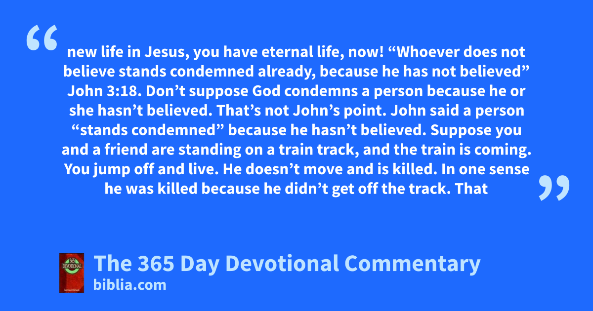 new life in Jesus, you have eternal life, now! “Whoever does not believe stands condemned already, because he has not believed” John 3:18. Don’t suppose God condemns a person because he or she hasn’t believed. That’s not John’s point. John said a person “stands condemned” because he hasn’t believed. Suppose you and a friend are standing on a train track, and the train is coming. You jump off and live. He doesn’t move and is killed. In one sense he was killed because he didn’t get off the track. That