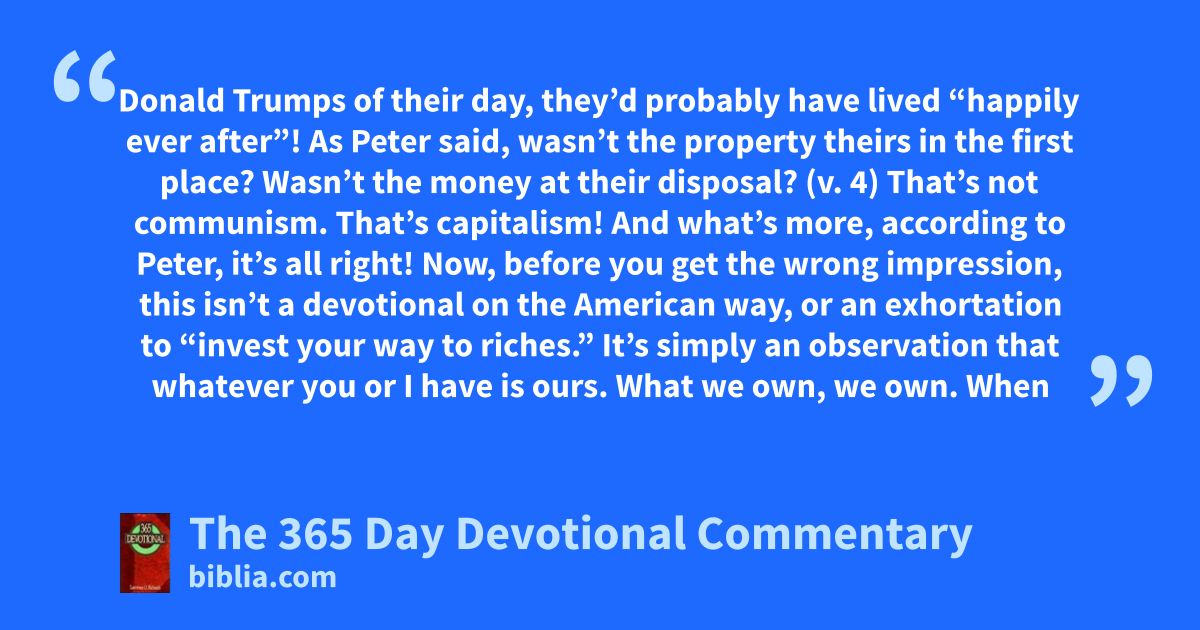 Donald Trumps of their day, they’d probably have lived “happily ever after”! As Peter said, wasn’t the property theirs in the first place? Wasn’t the money at their disposal? (v. 4) That’s not communism. That’s capitalism! And what’s more, according to Peter, it’s all right! Now, before you get the wrong impression, this isn’t a devotional on the American way, or an exhortation to “invest your way to riches.” It’s simply an observation that whatever you or I have is ours. What we own, we own. When