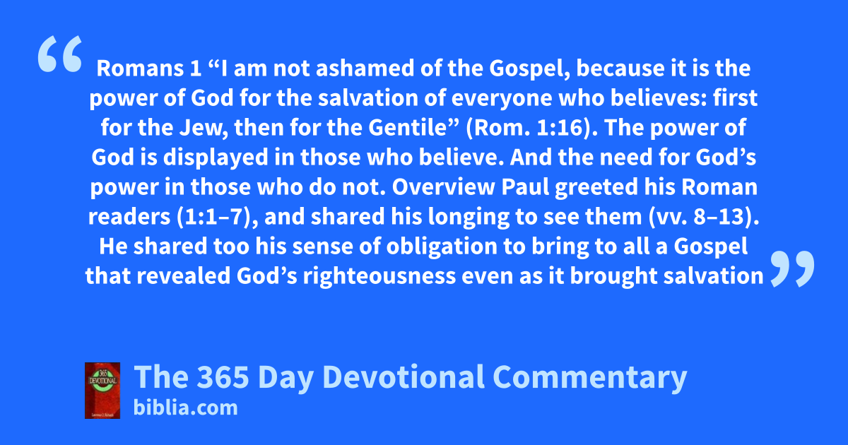Romans 1 “I am not ashamed of the Gospel, because it is the power of God for the salvation of everyone who believes: first for the Jew, then for the Gentile” (Rom. 1:16). The power of God is displayed in those who believe. And the need for God’s power in those who do not. Overview Paul greeted his Roman readers (1:1–7), and shared his longing to see them (vv. 8–13). He shared too his sense of obligation to bring to all a Gospel that revealed God’s righteousness even as it brought salvation