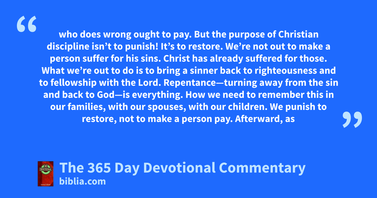 who does wrong ought to pay. But the purpose of Christian discipline isn’t to punish! It’s to restore. We’re not out to make a person suffer for his sins. Christ has already suffered for those. What we’re out to do is to bring a sinner back to righteousness and to fellowship with the Lord. Repentance—turning away from the sin and back to God—is everything. How we need to remember this in our families, with our spouses, with our children. We punish to restore, not to make a person pay. Afterward, as