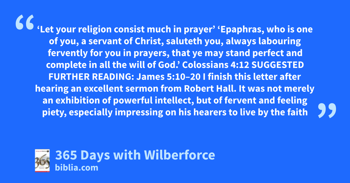 ‘Let your religion consist much in prayer’ ‘Epaphras, who is one of you, a servant of Christ, saluteth you, always labouring fervently for you in prayers, that ye may stand perfect and complete in all the will of God.’ Colossians 4:12 SUGGESTED FURTHER READING: James 5:10–20 I finish this letter after hearing an excellent sermon from Robert Hall. It was not merely an exhibition of powerful intellect, but of fervent and feeling piety, especially impressing on his hearers to live by the faith