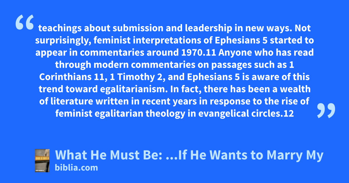 teachings about submission and leadership in new ways. Not surprisingly, feminist interpretations of Ephesians 5 started to appear in commentaries around 1970.11 Anyone who has read through modern commentaries on passages such as 1 Corinthians 11, 1 Timothy 2, and Ephesians 5 is aware of this trend toward egalitarianism. In fact, there has been a wealth of literature written in recent years in response to the rise of feminist egalitarian theology in evangelical circles.12