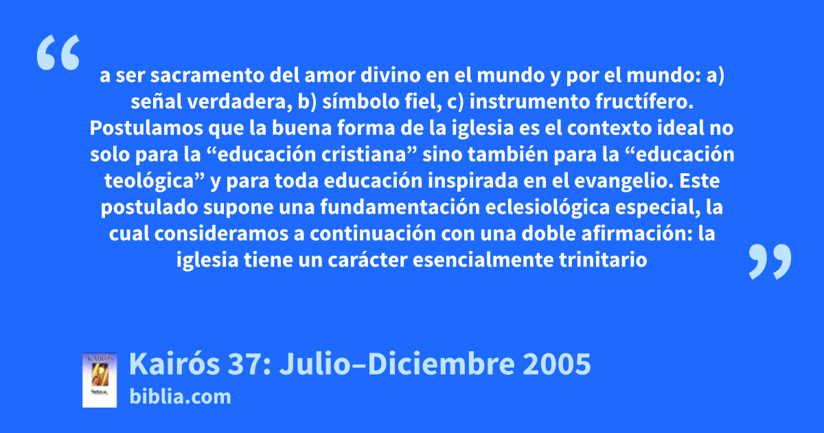a ser sacramento del amor divino en el mundo y por el mundo: a) señal verdadera, b) símbolo fiel, c) instrumento fructífero. Postulamos que la buena forma de la iglesia es el contexto ideal no solo para la “educación cristiana” sino también para la “educación teológica” y para toda educación inspirada en el evangelio. Este postulado supone una fundamentación eclesiológica especial, la cual consideramos a continuación con una doble afirmación: la iglesia tiene un carácter esencialmente trinitario