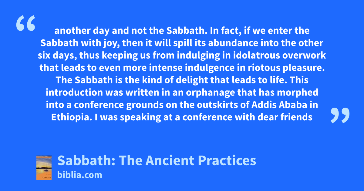 another day and not the Sabbath. In fact, if we enter the Sabbath with joy, then it will spill its abundance into the other six days, thus keeping us from indulging in idolatrous overwork that leads to even more intense indulgence in riotous pleasure. The Sabbath is the kind of delight that leads to life. This introduction was written in an orphanage that has morphed into a conference grounds on the outskirts of Addis Ababa in Ethiopia. I was speaking at a conference with dear friends