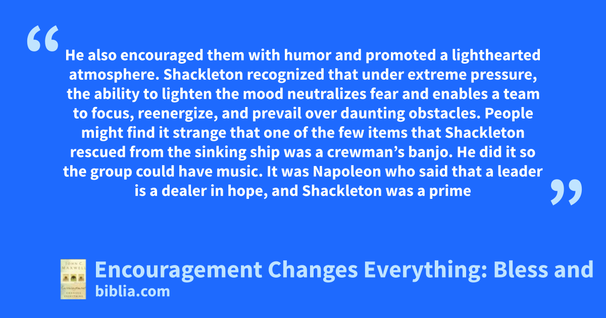 He also encouraged them with humor and promoted a lighthearted atmosphere. Shackleton recognized that under extreme pressure, the ability to lighten the mood neutralizes fear and enables a team to focus, reenergize, and prevail over daunting obstacles. People might find it strange that one of the few items that Shackleton rescued from the sinking ship was a crewman’s banjo. He did it so the group could have music. It was Napoleon who said that a leader is a dealer in hope, and Shackleton was a prime