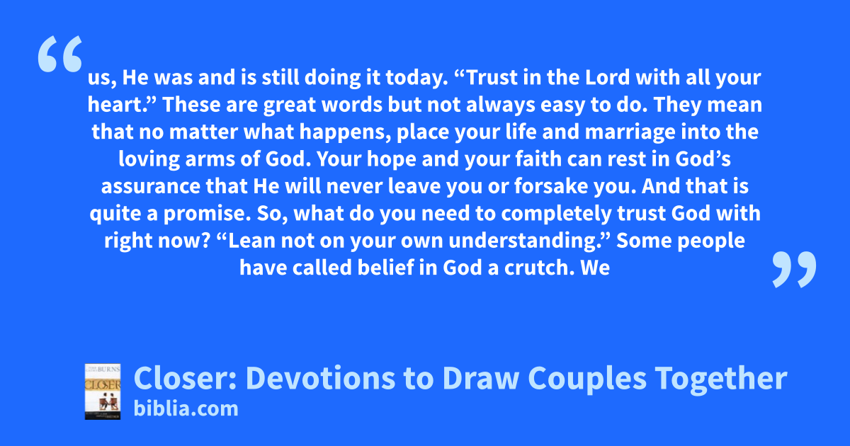 us, He was and is still doing it today. “Trust in the Lord with all your heart.” These are great words but not always easy to do. They mean that no matter what happens, place your life and marriage into the loving arms of God. Your hope and your faith can rest in God’s assurance that He will never leave you or forsake you. And that is quite a promise. So, what do you need to completely trust God with right now? “Lean not on your own understanding.” Some people have called belief in God a crutch. We