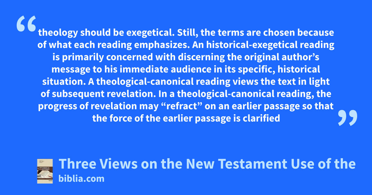 theology should be exegetical. Still, the terms are chosen because of what each reading emphasizes. An historical-exegetical reading is primarily concerned with discerning the original author’s message to his immediate audience in its specific, historical situation. A theological-canonical reading views the text in light of subsequent revelation. In a theological-canonical reading, the progress of revelation may “refract” on an earlier passage so that the force of the earlier passage is clarified