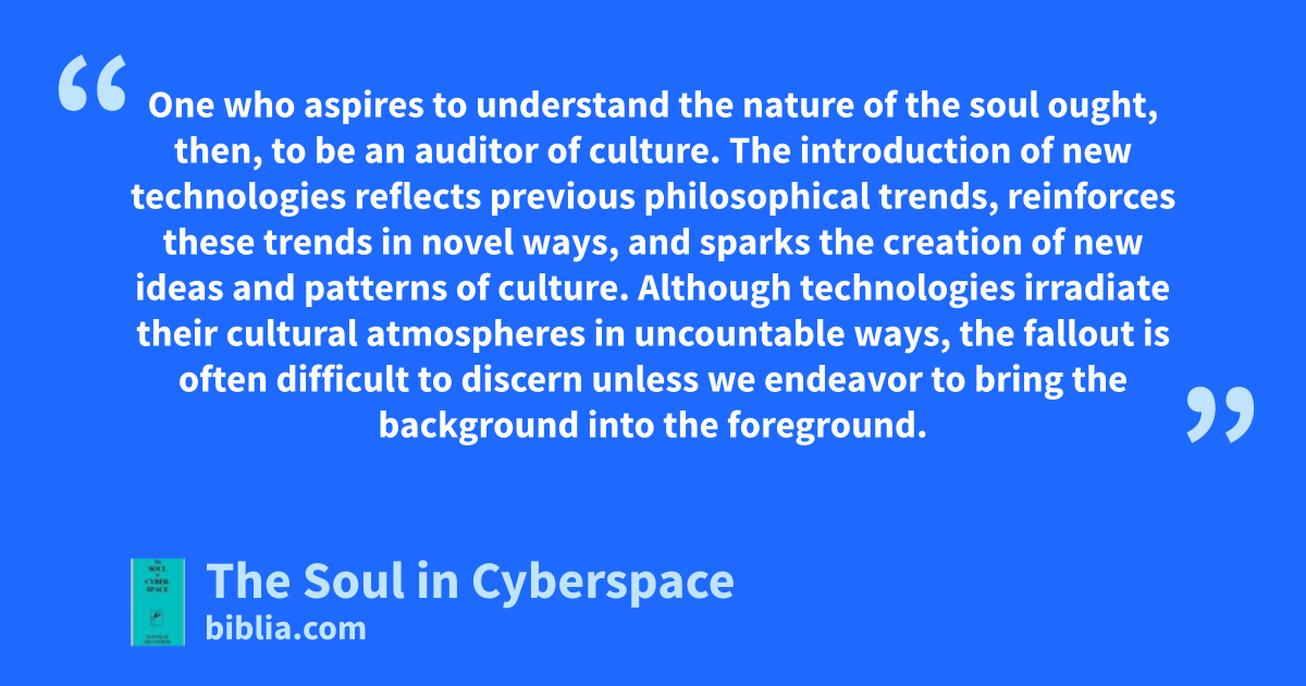 One who aspires to understand the nature of the soul ought, then, to be an auditor of culture. The introduction of new technologies reflects previous philosophical trends, reinforces these trends in novel ways, and sparks the creation of new ideas and patterns of culture. Although technologies irradiate their cultural atmospheres in uncountable ways, the fallout is often difficult to discern unless we endeavor to bring the background into the foreground.