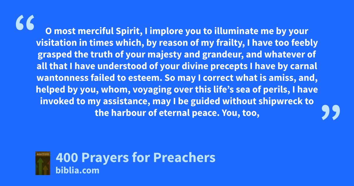 O most merciful Spirit, I implore you to illuminate me by your visitation in times which, by reason of my frailty, I have too feebly grasped the truth of your majesty and grandeur, and whatever of all that I have understood of your divine precepts I have by carnal wantonness failed to esteem. So may I correct what is amiss, and, helped by you, whom, voyaging over this life’s sea of perils, I have invoked to my assistance, may I be guided without shipwreck to the harbour of eternal peace. You, too,