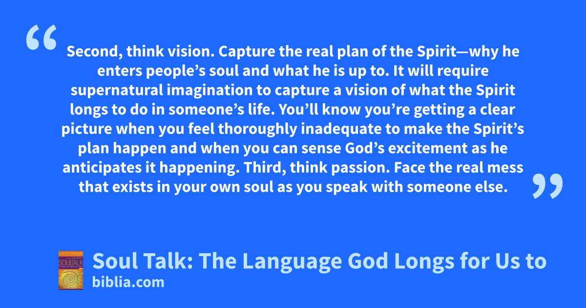 Second, think vision. Capture the real plan of the Spirit—why he enters people’s soul and what he is up to. It will require supernatural imagination to capture a vision of what the Spirit longs to do in someone’s life. You’ll know you’re getting a clear picture when you feel thoroughly inadequate to make the Spirit’s plan happen and when you can sense God’s excitement as he anticipates it happening. Third, think passion. Face the real mess that exists in your own soul as you speak with someone else.